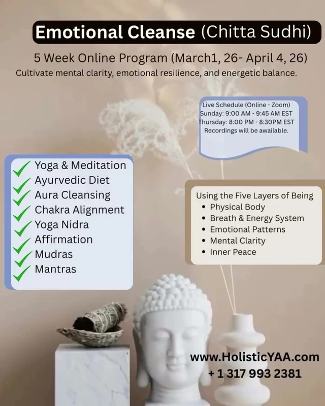 Emotional Cleanse (Chitta Sudhi) is a guided, Ayurvedic-inspired journey to clear mental clutter, release stored emotions, and return to a calmer, more centered you. In today’s fast-paced world, stress, overthinking, and unresolved feelings can build up in the mind (chitta) and show up as fatigue, irritability, poor sleep, cravings, or a sense of being “stuck.” This program offers a gentle, structured reset that supports emotional balance through time-tested practices from Ayurveda, yoga, breathwork, and mindful self-inquiry. Over the course of the program, you’ll learn how emotions relate to your dosha tendencies, daily routine, digestion, and nervous system. You’ll be guided through simple daily rituals, grounding yoga and pranayama, meditation prompts, and reflective exercises designed to help you observe patterns without judgment and create space for new, healthier responses. You’ll also receive practical lifestyle and food guidance to support sattva (clarity) and reduce the heaviness of tamas and agitation of rajas. This program is ideal for anyone feeling emotionally overwhelmed, mentally scattered, or ready to break repetitive cycles—whether you’re new to Ayurveda or already familiar with holistic living. Expect a compassionate, step-by-step approach that fits into real life, with clear instructions and supportive practices you can continue long after the cleanse. By the end, you’ll have a personalized toolkit to regulate your mood, improve sleep and focus, strengthen inner resilience, and reconnect with your natural sense of peace and purpose.