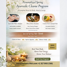 A holistic detox program designed to restore balance, improve digestion, and renew your energy through authentic Ayurvedic practices. This personalized cleanse is created using Ayurvedic Pulse Analysis (Nadi Pariksha) to understand your unique body constitution, current imbalances, and specific needs. Based on this assessment, a customized plan is developed to support your body in releasing toxins (Ama), strengthening digestion (Agni), and restoring overall well-being. The program includes a detailed Ayurvedic consultation, along with three therapeutic detox sessions designed to cleanse, relax, and rejuvenate the body. You will also receive personalized guidance on diet, lifestyle (Dinacharya), and simple breathwork practices to support long-term balance. This is not a restrictive or extreme detox. It is a gentle, structured, and sustainable approach that works with your body’s natural rhythms. Program Duration: Completed over two months Includes: Consultation + Pulse Analysis, 3 Detox Therapies, Personalized Diet & Lifestyle Plan Ideal for: Individuals experiencing fatigue, digestive issues, seasonal imbalance, mental fog, or those seeking a natural reset. Investment: Total Value $685 | Special Offer $560 Begin your journey toward clarity, lightness, and renewed vitality with a cleanse designed specifically for you.